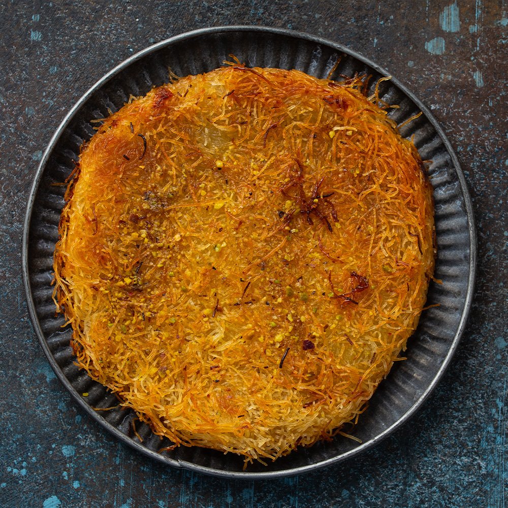 Classic Kurdish dessert of shredded wheat with a layer of melted cheese, topped with chopped pistachios and aromatic syrup.
